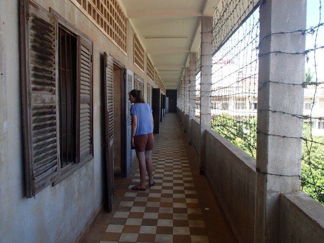 Each former classroom holds a selection of artefacts, starkly alone in the expanse of the floor. Rusted beds and manacles, extracts from the jailor’s records. Confessions and dispatch papers for those sent to Choeung Ek. Some rooms are mirrored in grainy black and white photos of themselves, taken by Vietnamese soldiers when they liberated the compound. Rough handmade walls of clay bricks subdivide the ground floor of the second building. The divisions form a dim warren of chambers, some an arm’s length wide. Fingernail marks scar the clay. In the third building, dusty billboards chronicle the work of the Extraordinary Chambers in the Courts of Cambodia, which has adjudged perpetrators of the genocide since 1997. Shrivelled grandfathers feature in the witness box alongside neat lists of their crimes.